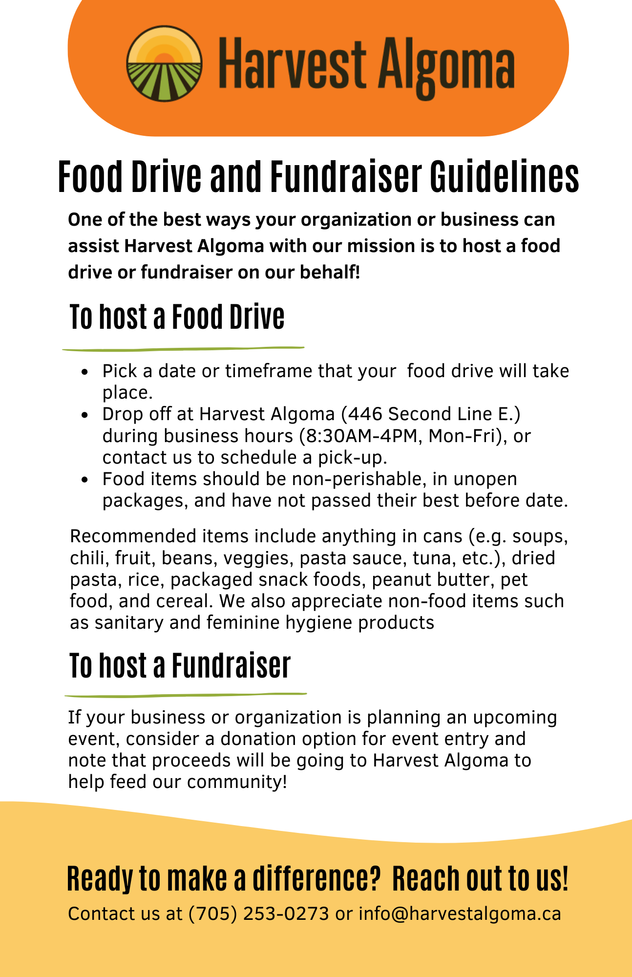 Ignite change in your community or workplace by hosting a food drive or fundraiser for Harvest Algoma. Let us collaborate with you to amplify your initiative, providing marketing materials and tools to ensure its success. Your efforts directly contribute to our shared goal of eliminating hunger.